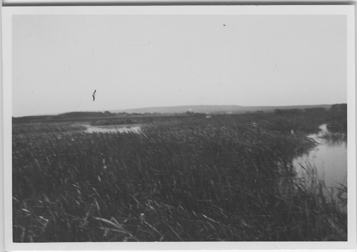 'Ingår serie 4385:1-27 från Biologiska föreningens utfärd till sjön Östen och Kinnekulle. :: :: Vy över sjön Östen, enligt text på baksidan: ''Från Östans utlopp i Östen, där dvärgmåsarna höllo flyguppvisning.'' Vassvegetation i sjön.'