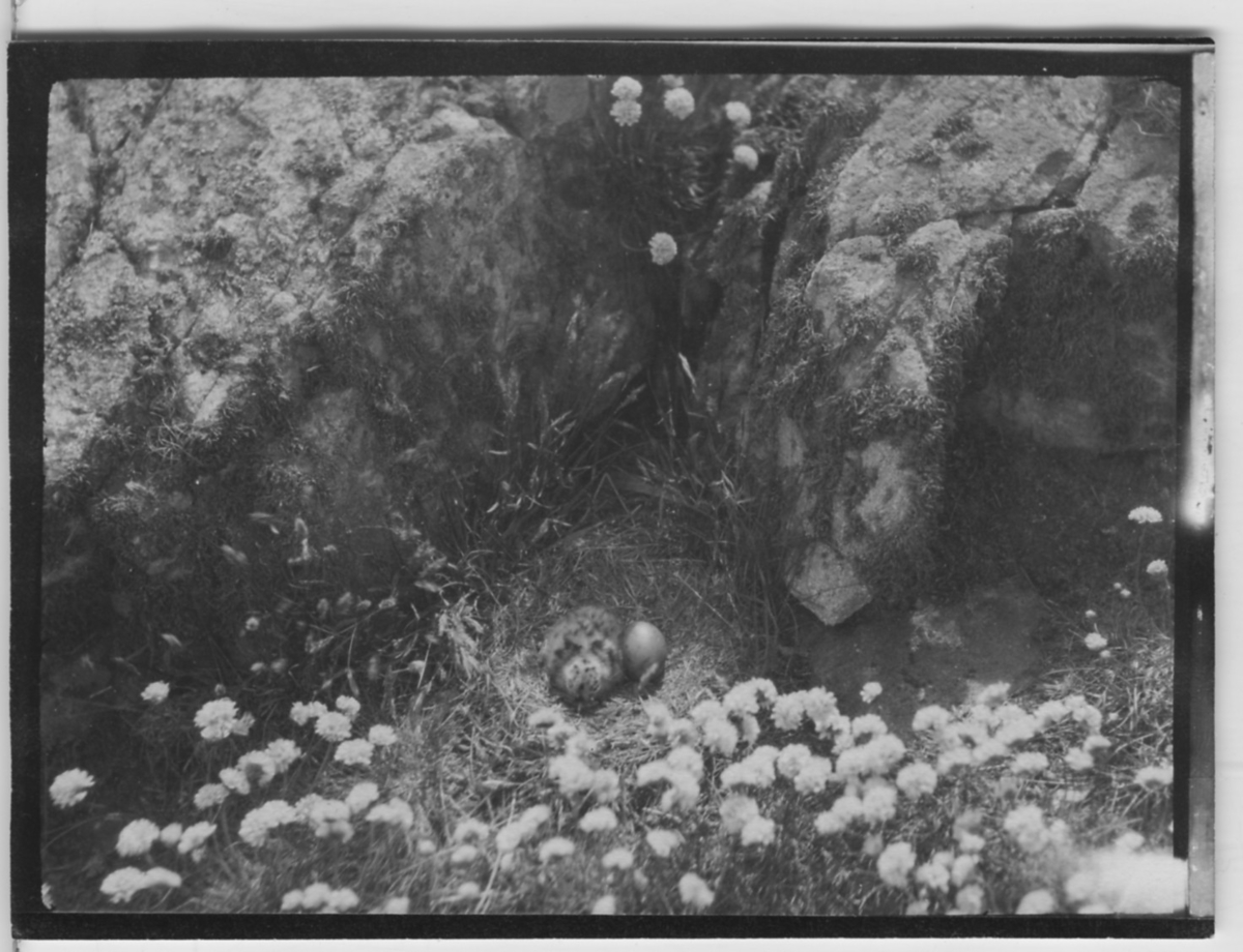 'Biologiska föreningens utfärd till Hallands Väderö: :: :: Närbild av fågelbo med 1 ägg och en unge. Intill bergshäll bland trift. :: :: Se fotonr. 1464 och 4311:1-58 från samma utfärd.'