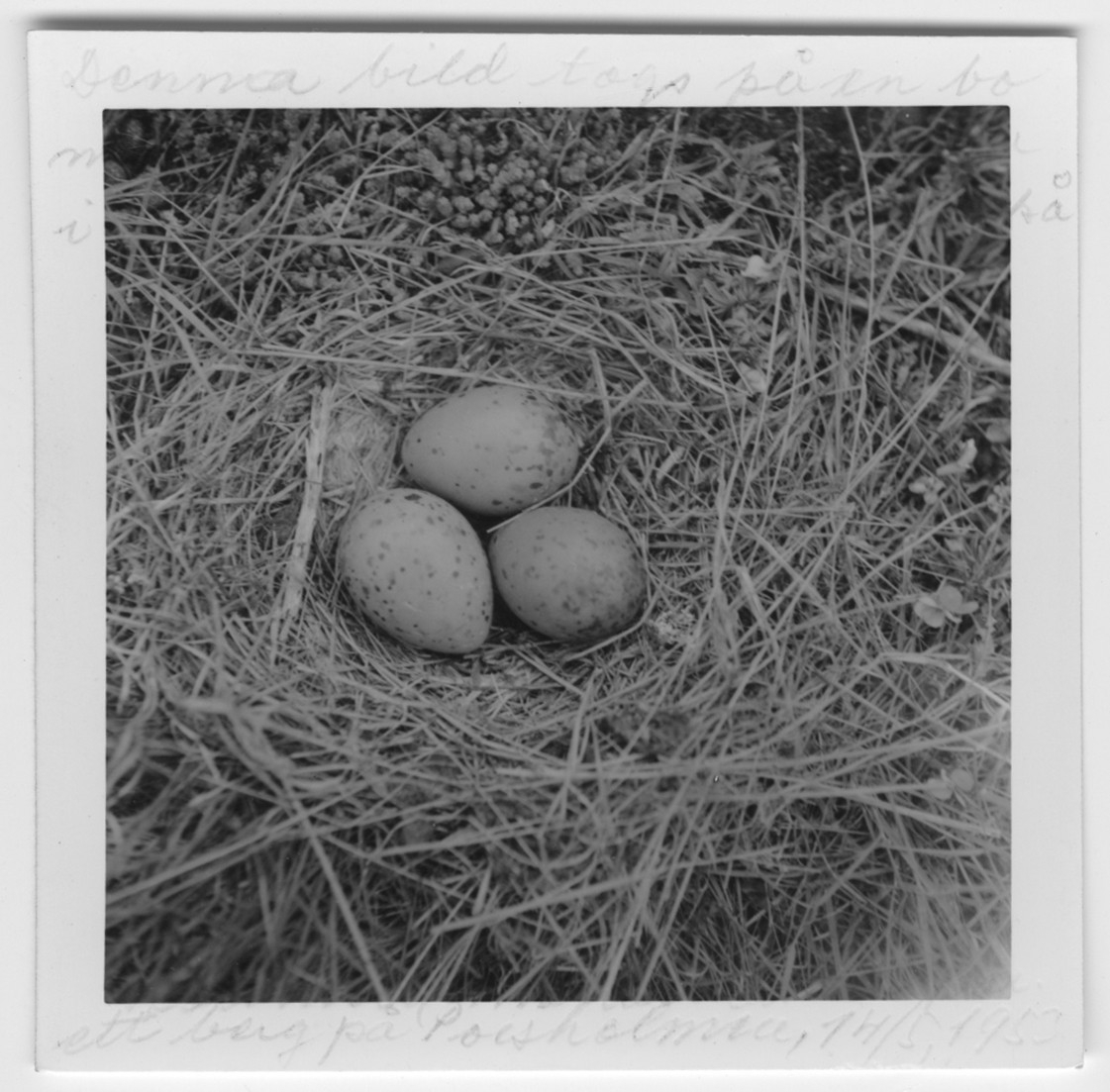 'Bo med 3 fiskmåsägg. :: :: Text på fotot: ''Denna bild togs på ett bo med 3 st ägg av fiskmåsen i en bergsklyfta uppe på. Bilden togs på 40 meters avstånd. Kolonin hade 400 par. :: :: Ingår i serie med fotonr. 4545:1-34.'
