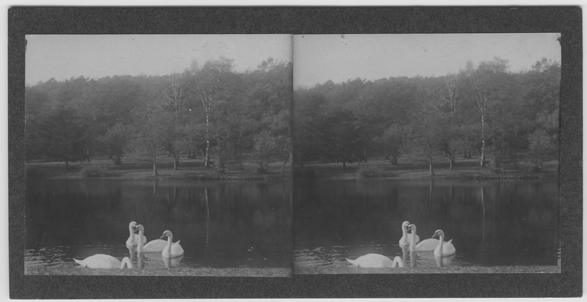 'Knölsvanar, 4 st, i dammen. Vy med fågeldammen och i fonden träd. :: :: Ingår i serie med fotonr. 440-448.'