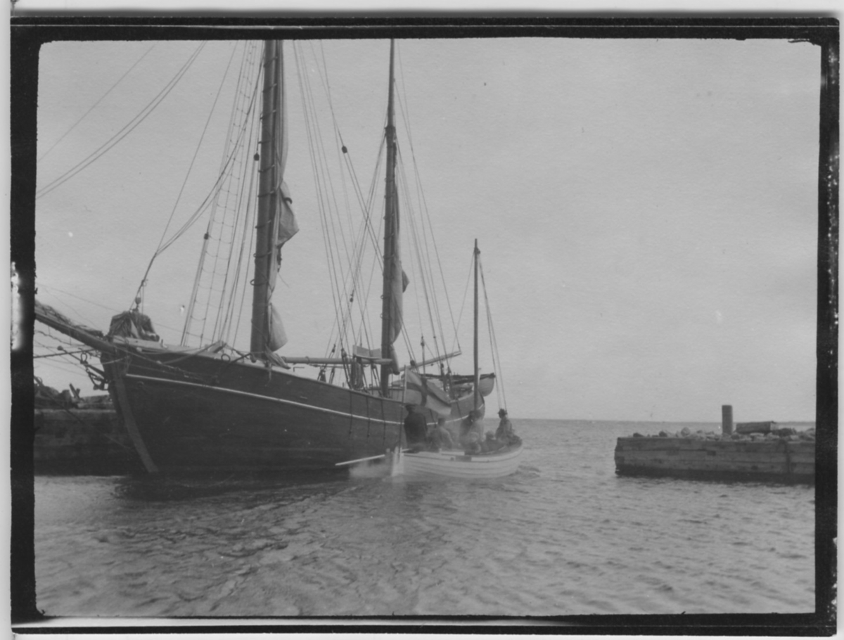 'Biologiska föreningens utfärd till Hallands Väderö: :: :: Mindre båt, med ett antal män ombord, intill en större båt i hamninloppet. Vy ut mot havet. :: :: Se fotonr. 1464 och 4311:1-58 från samma utfärd.'