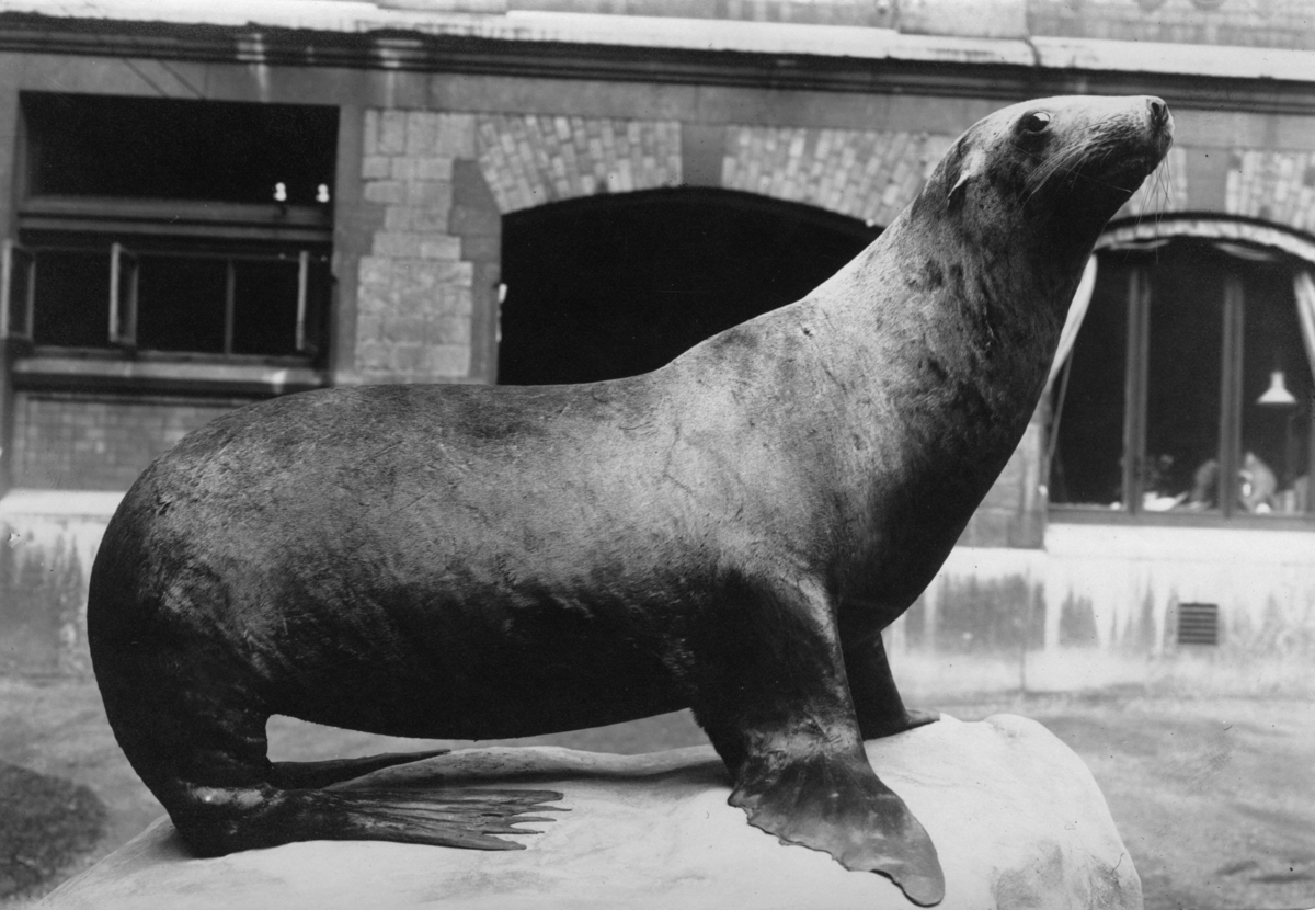 'Sjölejon, hona, montering uppställd på innergården till Ostindiska huset. :: :: Coll.an.3504. Fynddatum: 1915-05-17. :: :: Monterad av Hilmer Skoog'
