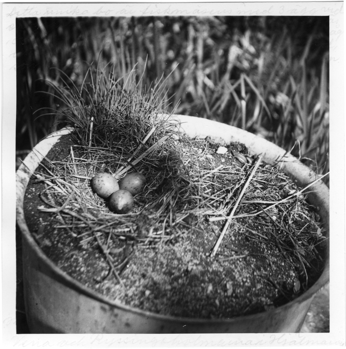 'Enligt anteckning på fotografiets baksida: :: ''Detta unika bo är fiskmåsens med 3 ägg vid en grästuva och reden bestod av torrt gräs och vasspinnar. Som synes av bilden, låg det i en stor järngryta fylld med jord, som stod på en flat sten en meter från ön. Man ser vassen i bakgrunden.'' :: :: Ingår i en serie med fotonr. 4512:1-57 med diverse foton av fågelbon med ägg och ungar. Varje fotografi har utförliga anteckningar på sin baksida, kopierade från framsidan, spår av de på framsidan är fortfarande synliga.'