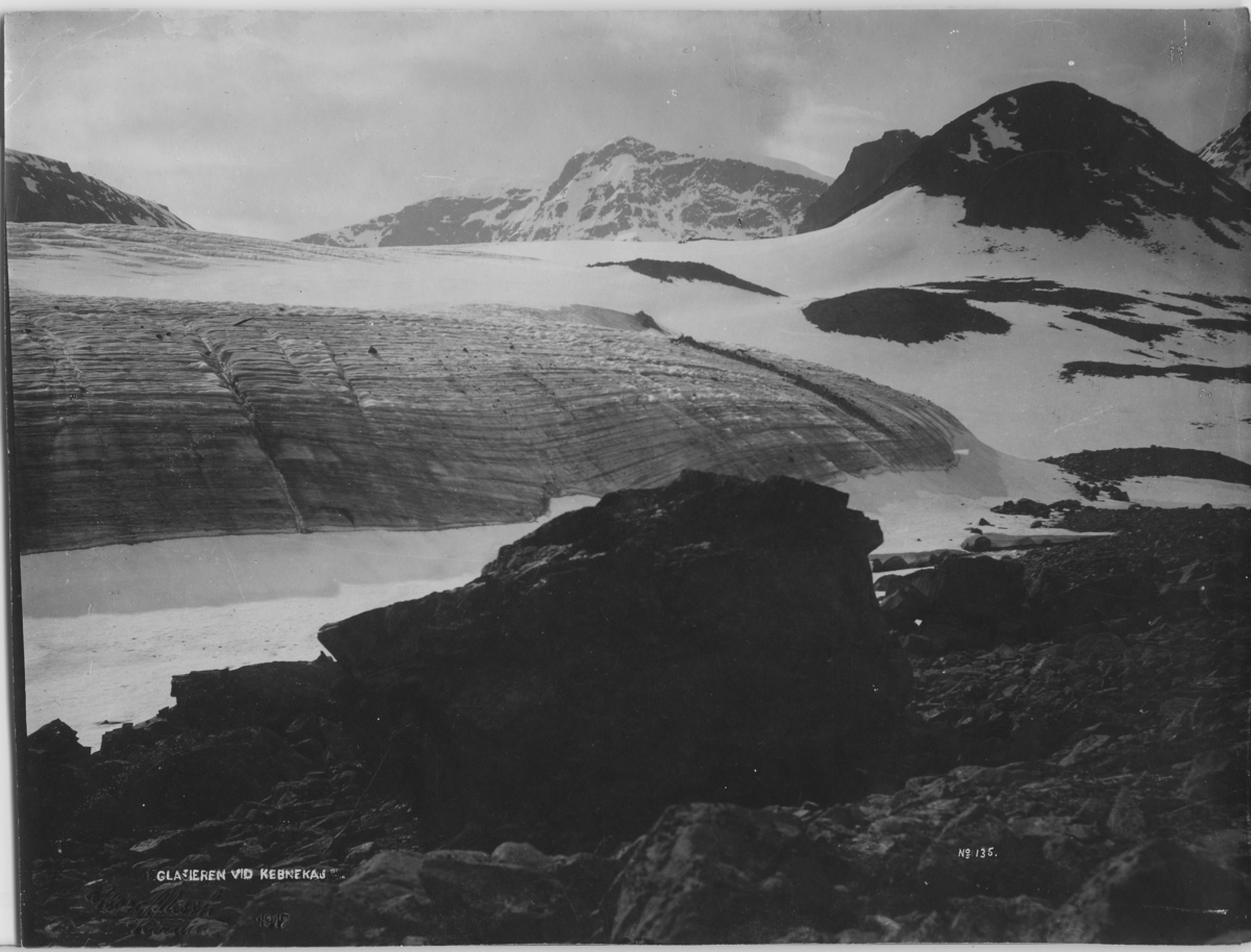 'Glaciärkanten vid Kebnekajse. Snöklädda bergstoppar. :: :: Ingår i serie med fotonr 4871-4879.'