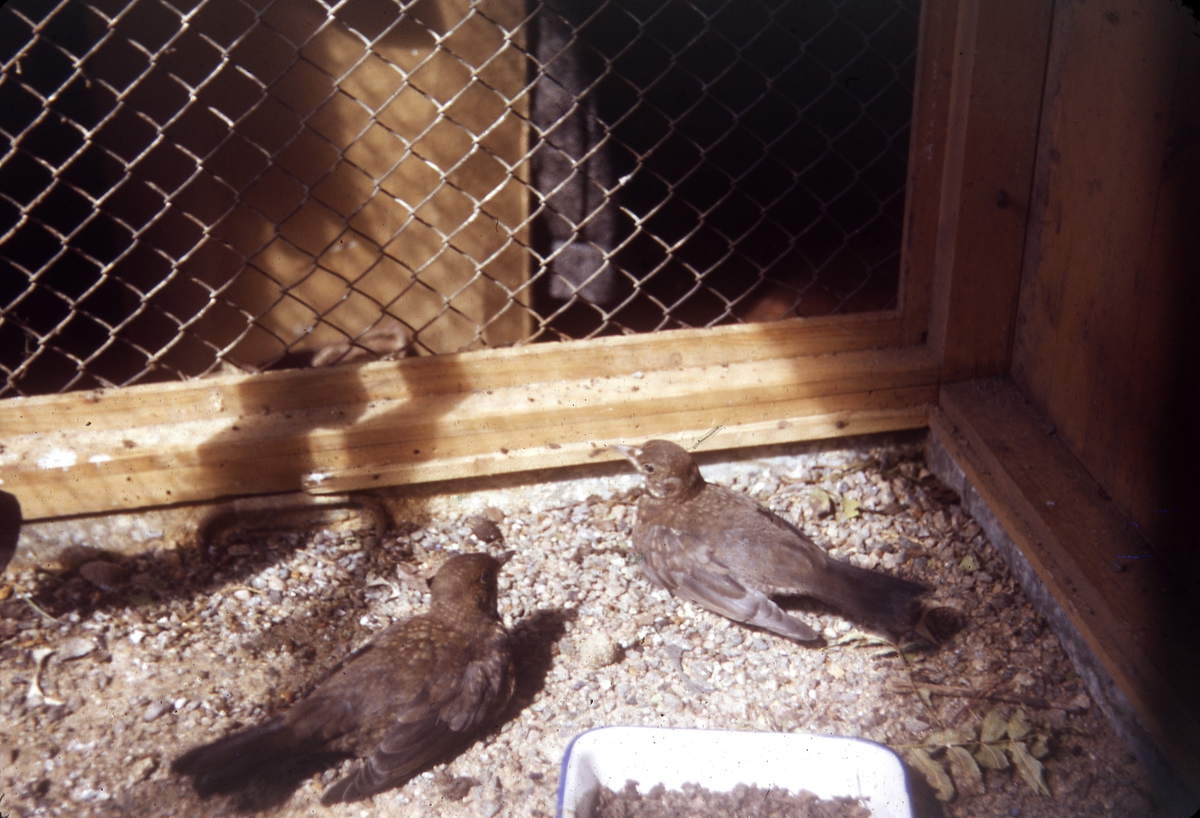 '2 bastarder mellan björktrast och koltrast, innanför nät i bur. Fåglarna på marken bredvid matskål. :: :: Ingår i serie med fotonr. 4696:1-5. Se även fotonr 4652.'