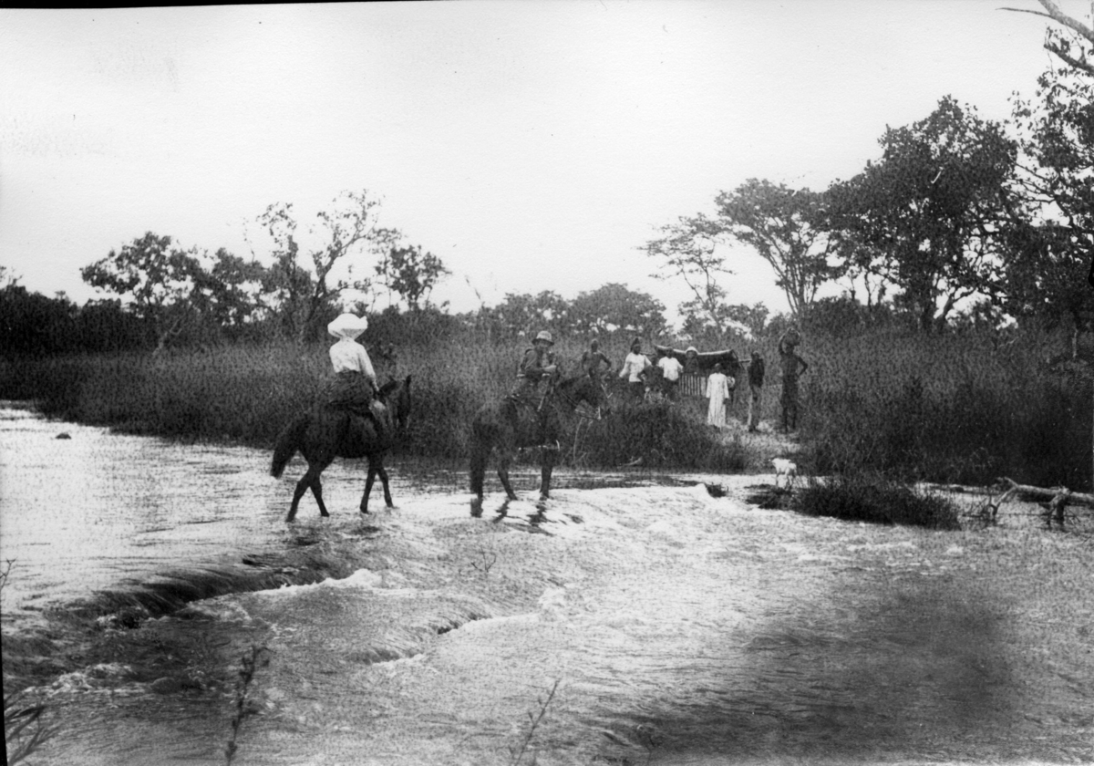 'Diverse fotografier från bl.a. dåvarande Nordrhodesia, nu Zambia, tagna av Konsul Magnus Leijer. :: :: 1 st man och 1 st kvinna ridande över ett vattendrag på stranden står 6 st män och 1 st barn med packning. Även en hund i vattnet.'
