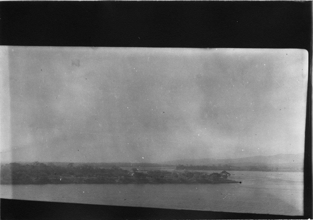 'Diverse fotografier från bl.a. dåvarande Nordrhodesia, nu Zambia, tagna av Konsul Magnus Leijer. :: :: Vy över landskap stor vattensamling och en landtunga ut i det, träd och byggnader synliga på denna. I bakgrunden berg.'