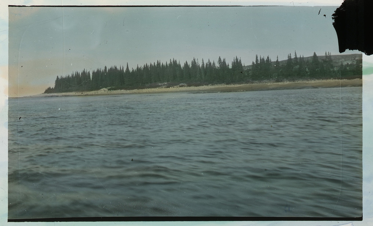 'Vy in mot strand med barrskog på land. :: :: Ingår i serie med fotonr. 5204:1-19. Se även hela fotonr. 5202-5218 med bilder från Frits Johansen.'