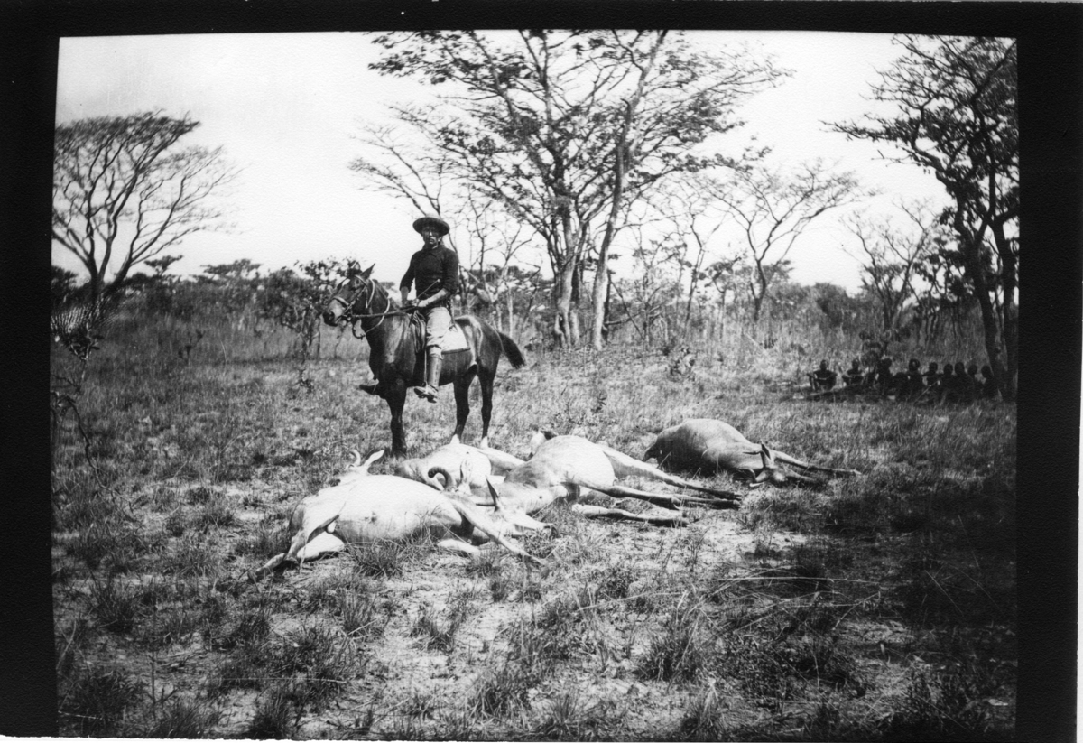 'Diverse fotografier från bl.a. dåvarande Nordrhodesia, nu Zambia, tagna av Konsul Magnus Leijer. :: :: 1 st man till häst, bakom fyra döda djurkroppar liggande på marken. I bakgrunden bland träden sitter en grupp, ca 10 st, män.'