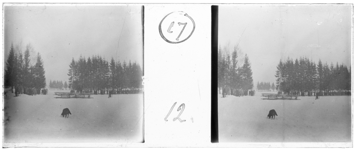 'Bildtext: ''Hinderhoppning.'' :: Vy med en hund i förgrunden, på avstånd syns grupper av människor stående kring uppsatta hinder för hästhoppning. Snöklädd mark. :: :: Ingår i serie med fotonr. 5253:1-18, se även hela serien med fotonr. 5237-5267.'