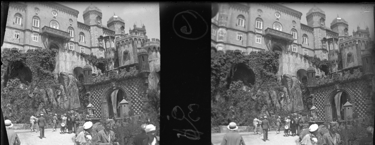 'Bildtext: ''''Drottningholms'' kryss till Södern: Borggårdsporten.'' :: Vy med del av The Pena National Palace byggnaden. På borggården folksamling. I förgrunden står 1 man och 2 kvinnor. :: :: :: Ingår i serie med fotonr 5266:1-16. Se även hela serien med fotonr. 5237-5267.'