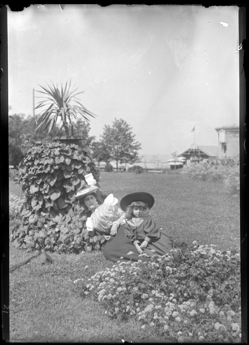 '1 kvinna och 1 barn, flicka, sittande på gräsmatta vid blomsterarrangemang invid rabatt. Kläder. Klädsel. Hatt. :: :: Ingår i serie med fotonr. 5274:1-22. Se även fotonr. 5269-5292 med bilder från Stuxbergs resa till Kaukasien.'