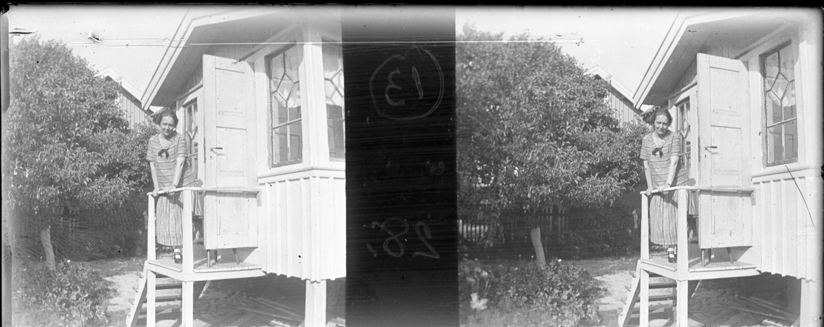 'Bildtext: ''Kyrkesund, vid Hannas stuga.'' :: Vy med 1 kvinna stående på trätrappa till hus. Klädsel. :: :: :: Ingår i serie med fotonr. 5264:1-16. Se även hela serien med fotonr. 5237-5267.'
