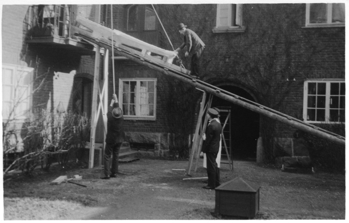 'Gipsavgjutning av halvspäckhuggarhane 3,69 m lång förs in/ut på ramp från konservatorsateljen till gården. :: :: Ingår i serie med fotonr. 3241:1-5.'