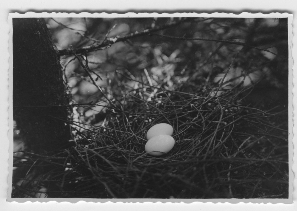 'Bo med 2 ägg av ringduva, på Jäverön. Närbild på boet invid granstam. :: :: Se serie med fotonr. 3650-3660.'
