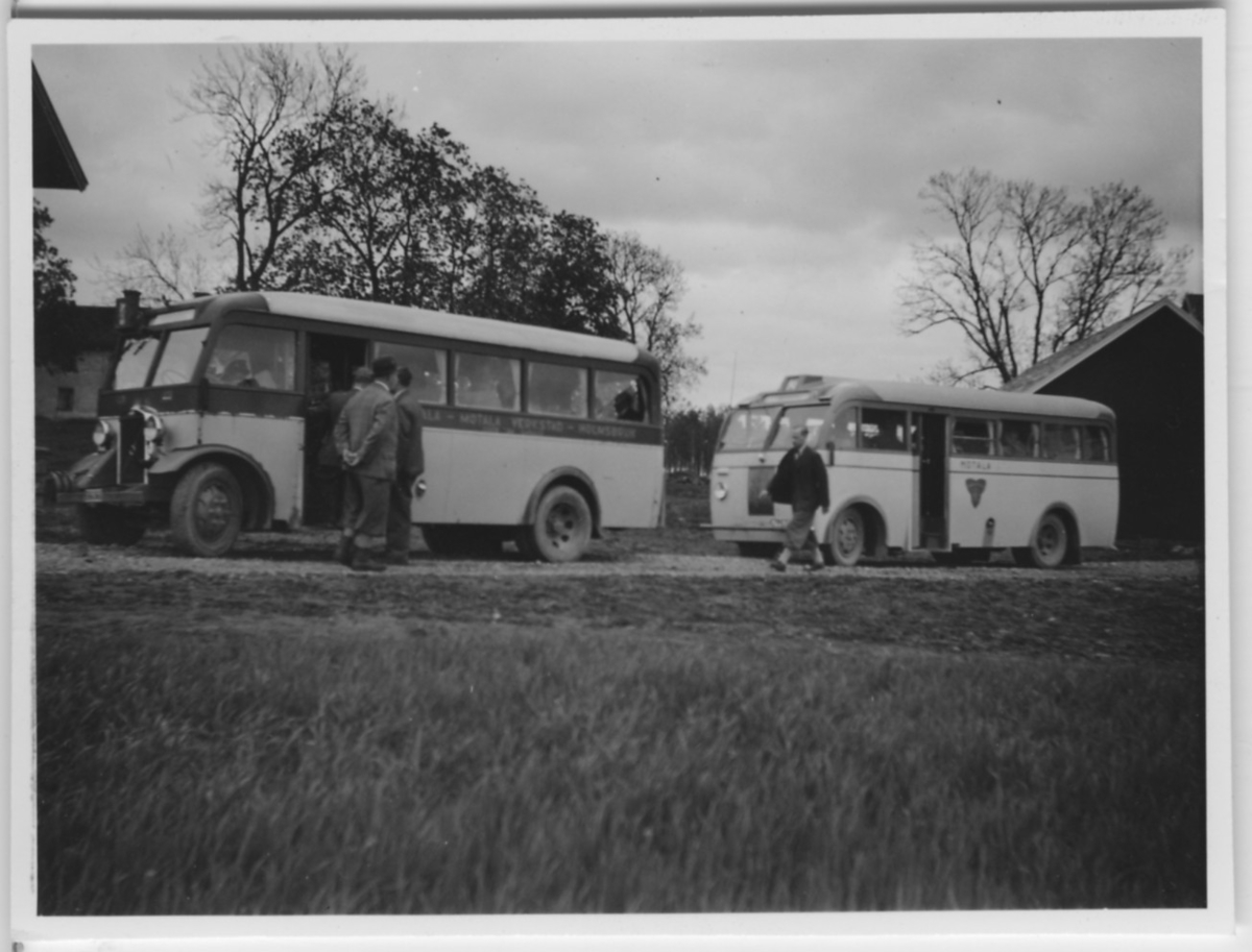 'Biologiska föreningens utfärd till Tåkern, Vadstena m.fl. platser: :: :: 2 bussar parkerade efter varandra på en väg. På bussarnas sidor står ''MOTALA - VERKSTAD''. I bakgrunden lövträd och hus. Ca 4 män utanför bussarna samt personer sittande i bussarna. :: :: Se fotonr. 3588-3634 samt 3661-3677.'