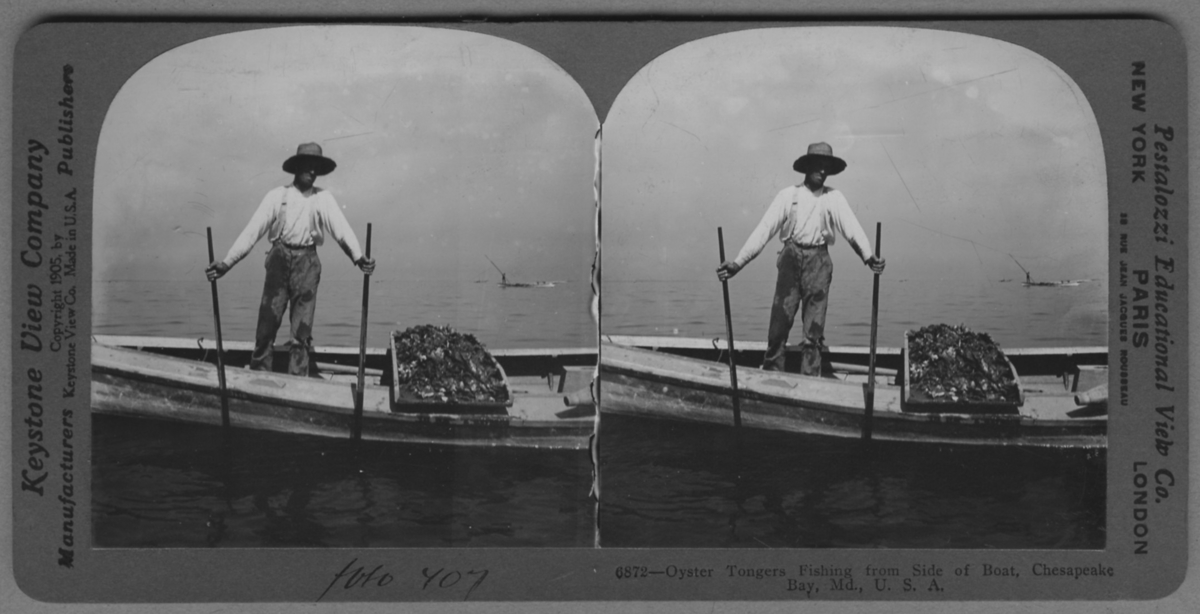'Ostronfiske med tänger intill eka. Man står upp i ekan och håller i 2 tänger. :: :: ''6872 - Oyster tongers fishing from side of boat, Chesapeake Bay, Md., U.S.A.'' :: :: Ingår i serie med fotonr. 315-422. Se särskilt fotonr. 421 och 418.'