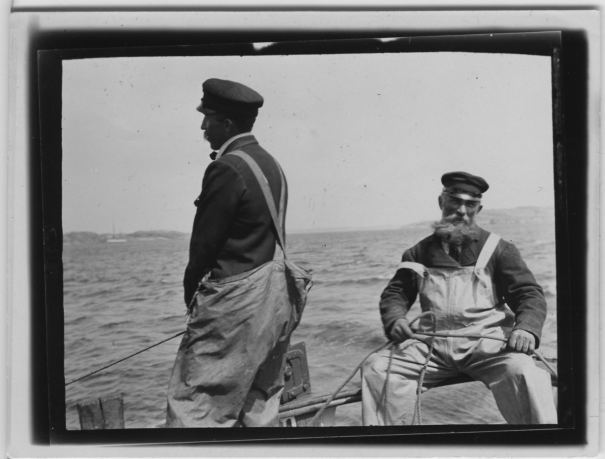 'Biologiska föreningens utfärd till Kristineberg: :: :: 2 män i en båt, ''Henrik och Charles Henriksson''. Båda bär hängselbyxor och kepsar. :: :: Ingår i serie med fotonr. 4242:1-14.'