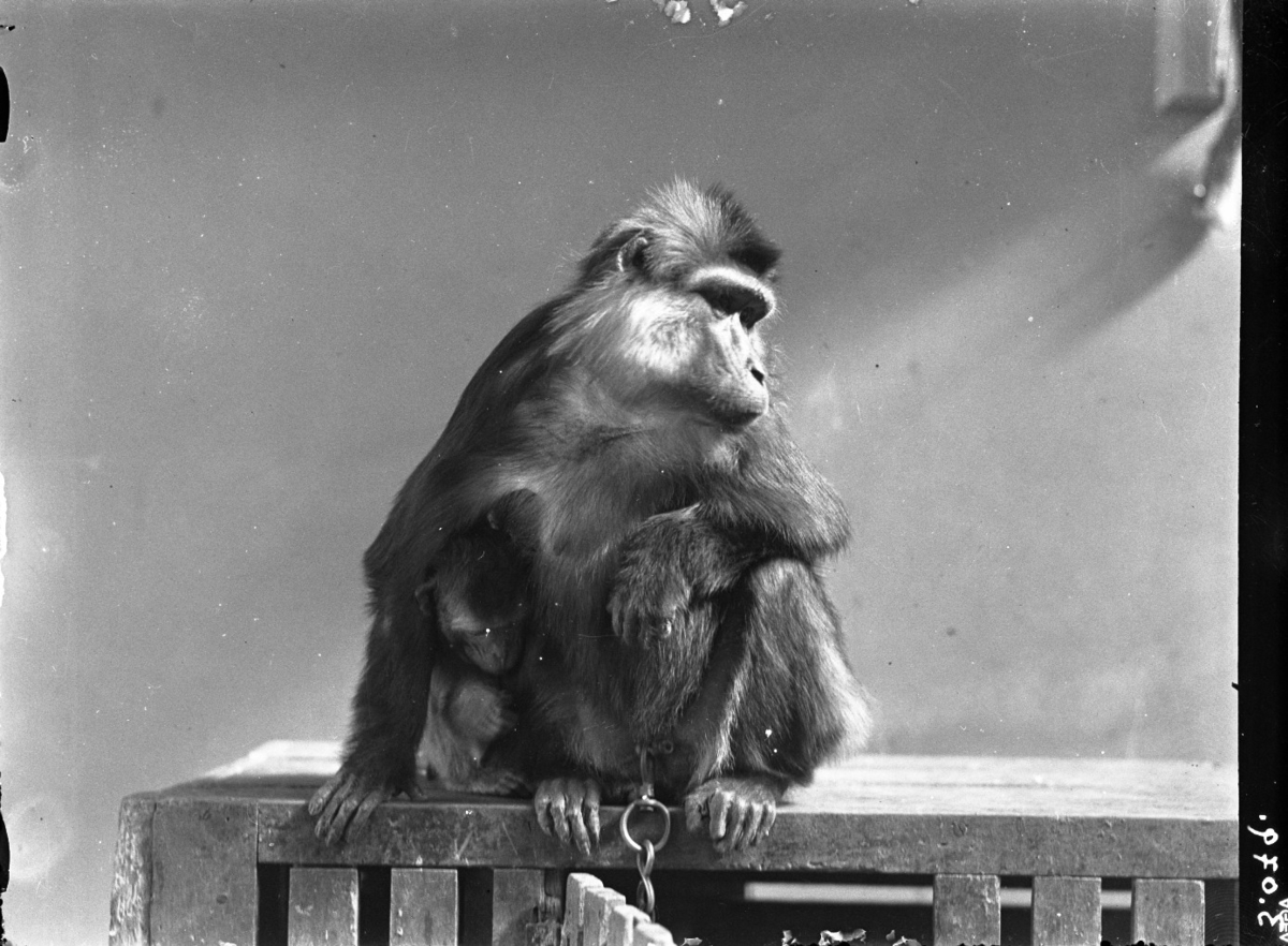 'Museiapan ''Monjet'', sittande på sin träbur. Närbild. :: :: Se även fotonr. 951-952, 2575, 2973, 3375 och 3079. Monjet (Gen.kat.nr. 1938-7467) finns i monter nr 37 i däggdjurssalen (25-05-2007) på Göteborgs Naturhistoriska museum. :: :: Monjet, ca 22 år gammal hona död 1938 (Gen.kat.nr. 1938-7467), levde på Göteborgs Naturhistoriska museum under större delen av sitt liv. finns i monter nr 37 i däggdjurssalen (25-05-2007) på Göteborgs Naturhistoriska museum. Monterad av David Sjölander.'