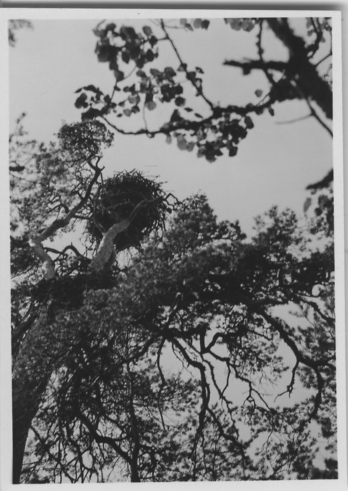 'Biologiska föreningens utfärd till Läckö och Lilla Ekens skärgård: :: :: Fiskgjusebo i träd. Vy upp mot boet i talltoppar. :: :: Se fotonr. 3242-3254, 3255, 3256-3259, 3260-3285 samt 3889-3894.'