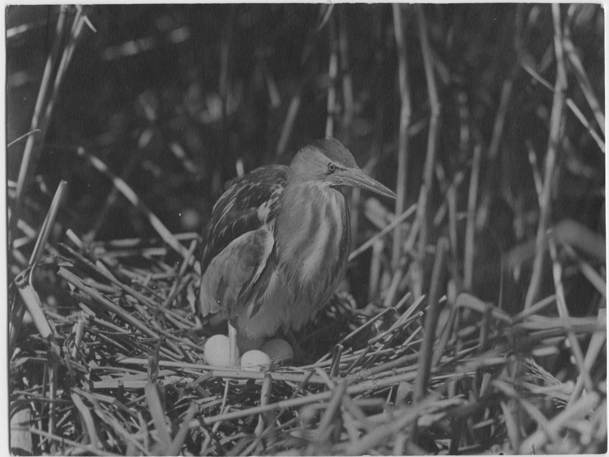 'Dvärgrördrom med minst 4 ägg i boet, närbild i vass. :: :: Se fotonr. 3460-3462.'
