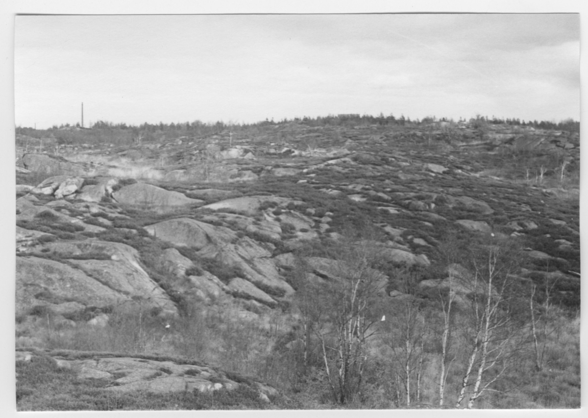 'Bildtext: ''Hällparti. Riktning 59.'' :: Vy över berghällsparti. :: :: Ingår i serie med fotonr. 6970:1-1125, dokumentation av Hisingens naturgeografi, visande landskapsformerna i stora drag och gjord inför exploateringen av området. Platserna för fotograferingen finns utsatta på karta i skala 1:4000 som finns på Göteborgs Naturhistoriska musem. Fotoriktningen mättes med kompass i gammalgrader.'
