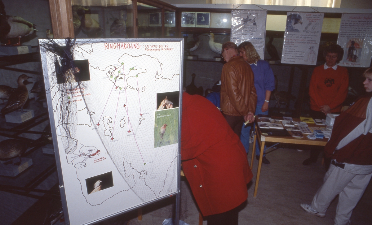 'Del av utställningen, utställningstavla med rubrik ''Ringmärkning''. Ca 5 personer. I bakgrunden glasmontrar med monterade fåglar. :: :: Ingår i serie med fotonr. 6668:11-31 med bilder från temadag om burfåglar ''Fåglar hemma och ute.'''