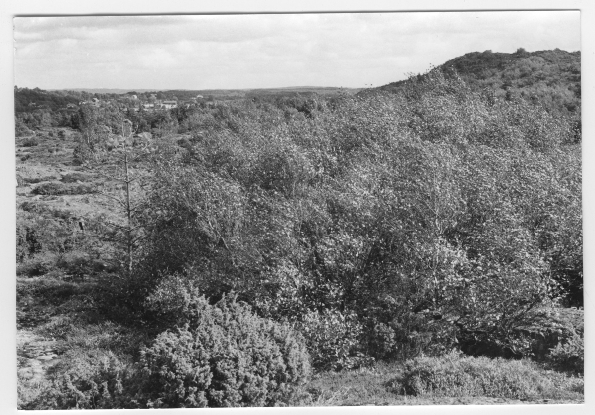 'Björksnår. Riktning 70.'' :: Berghäll med björkdunge med insprängda enbuskar. På avstånd syns hus. :: :: Ingår i serie med fotonr. 6970:1-1125, dokumentation av Hisingens naturgeografi, visande landskapsformerna i stora drag och gjord inför exploateringen av området. Platserna för fotograferingen finns utsatta på karta i skala 1:4000 som finns på Göteborgs Naturhistoriska musem. Fotoriktningen mättes med kompass i gammalgrader.'