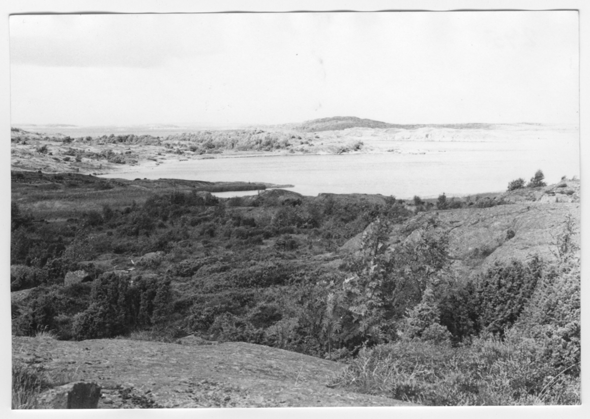 'Bildtext: ''Havsvik med strandäng. Riktning 292.'' :: Vy med strandängen med öppet parti samt parti med träd och buskar, enbuskar. Vy med havet och berghällar. :: :: Ingår i serie med fotonr. 6970:1-1125, dokumentation av Hisingens naturgeografi, visande landskapsformerna i stora drag och gjord inför exploateringen av området. Platserna för fotograferingen finns utsatta på karta i skala 1:4000 som finns på Göteborgs Naturhistoriska musem. Fotoriktningen mättes med kompass i gammalgrader.'