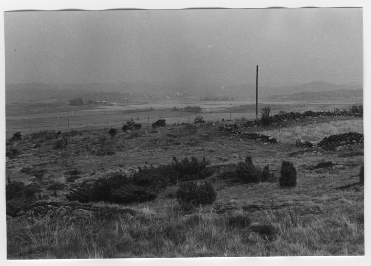 'Bildtext: ''Sedimentdalgång. Riktning 72.'' I förgrunden öppen gräsmark med stenmurar och enbuskar. Vy ut över öppna fält, åkrar, elledning. På avstånd hus. Stengärdesgård. :: :: Ingår i serie med fotonr. 6970:1-1125, dokumentation av Hisingens naturgeografi, visande landskapsformerna i stora drag och gjord inför exploateringen av området. Platserna för fotograferingen finns utsatta på karta i skala 1:4000 som finns på Göteborgs Naturhistoriska musem. Fotoriktningen mättes med kompass i gammalgrader.'