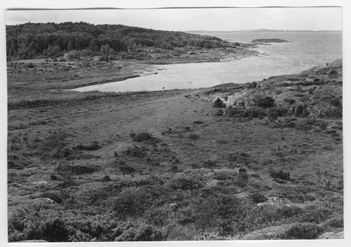 'Bildtext: ''Strandäng. Riktning 244.'' I förgrunden berghäll med lågväxande enbuskar. Vy ner mot strandäng stenmur ner mot stranden. Områden med enbuskar. På avstånd trädbevuxna berghällar. Stengärdesgård. :: :: Ingår i serie med fotonr. 6970:1-1125, dokumentation av Hisingens naturgeografi, visande landskapsformerna i stora drag och gjord inför exploateringen av området. Platserna för fotograferingen finns utsatta på karta i skala 1:4000 som finns på Göteborgs Naturhistoriska musem. Fotoriktningen mättes med kompass i gammalgrader.'