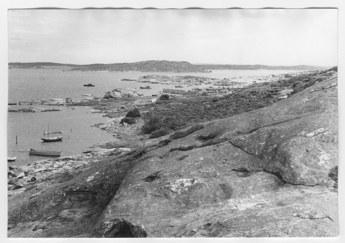 'Kuststräcka med strandäng. Riktning 60.'' :: Vy över strandparti med angränsade strandäng med grästuvor. I vattnet ligger båtar och bryggor. Berghällar ner mot vattnet. :: :: Ingår i serie med fotonr. 6970:1-1125, dokumentation av Hisingens naturgeografi, visande landskapsformerna i stora drag och gjord inför exploateringen av området. Platserna för fotograferingen finns utsatta på karta i skala 1:4000 som finns på Göteborgs Naturhistoriska musem. Fotoriktningen mättes med kompass i gammalgrader.'