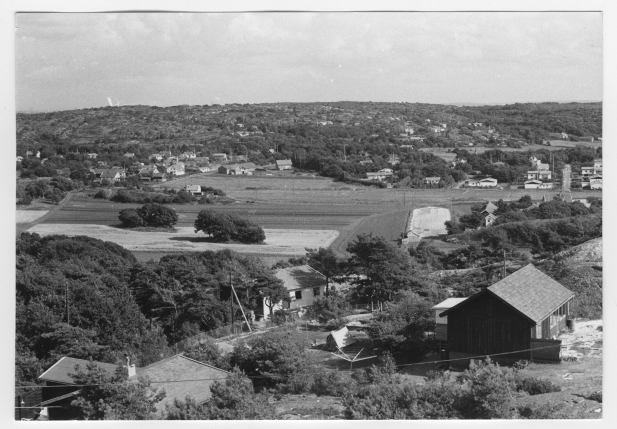 'Bildtext: ''Uppodlad sedimentdal. Riktning 108.'' Vy över dal med åkrar och med hus på höjderna invid. :: :: Ingår i serie med fotonr. 6970:1-1125, dokumentation av Hisingens naturgeografi, visande landskapsformerna i stora drag och gjord inför exploateringen av området. Platserna för fotograferingen finns utsatta på karta i skala 1:4000 som finns på Göteborgs Naturhistoriska musem. Fotoriktningen mättes med kompass i gammalgrader.'