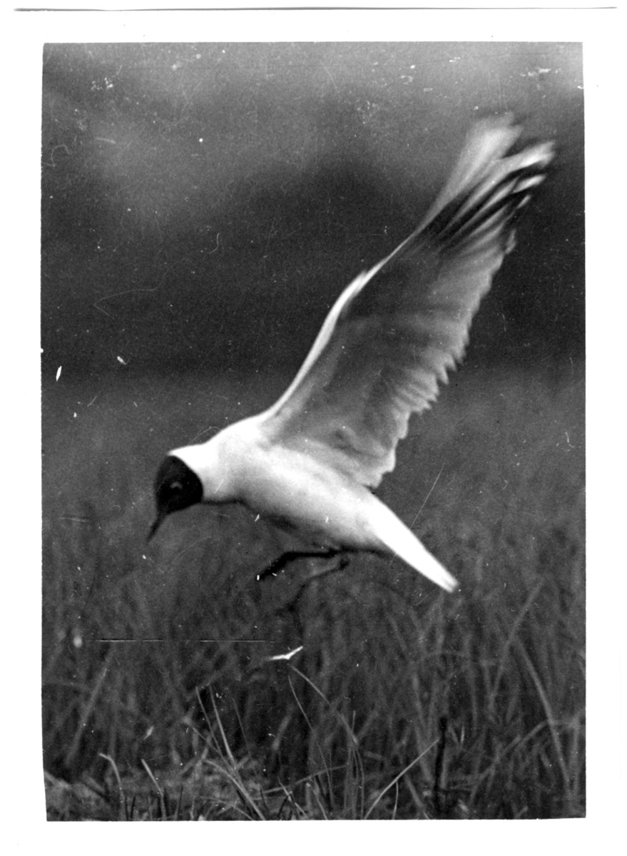 'Skrattmås på väg att landa i högt gräs. :: Text till fotot: ''Skrattmåsen. Här i Sörnypan fann jag i vår en koloni på ca 60 par skrattmåsar och denna utgör den nordligaste häckplatsen för denna fågel.'' :: :: Ingår i fotonr. 6995:1-51, dessa sitter i ett fotoalbum med tillhörande beskrivningar på norska.'