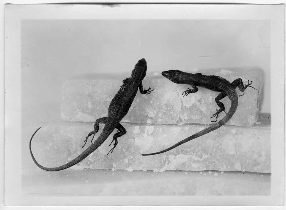 '2 ödlor, hona och hane. :: :: Ingår i serie med fotonr. 7015:1-91 med bilder av reptiler från Otto Cyréns samling.'