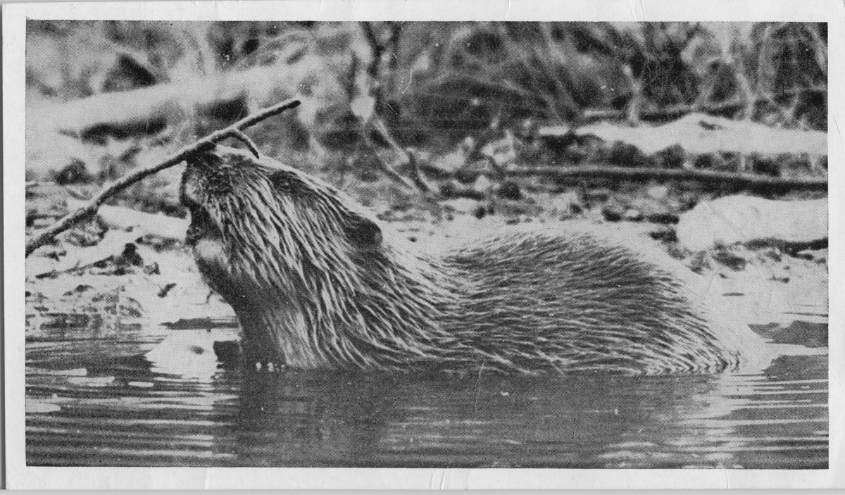 'Närbilder på bävrar som fäller träd. :: :: En bäver simmandes i ett vattendrag med en kvist på nosen. :: :: Ingår i serie med fotonr. 5670:1-27.'