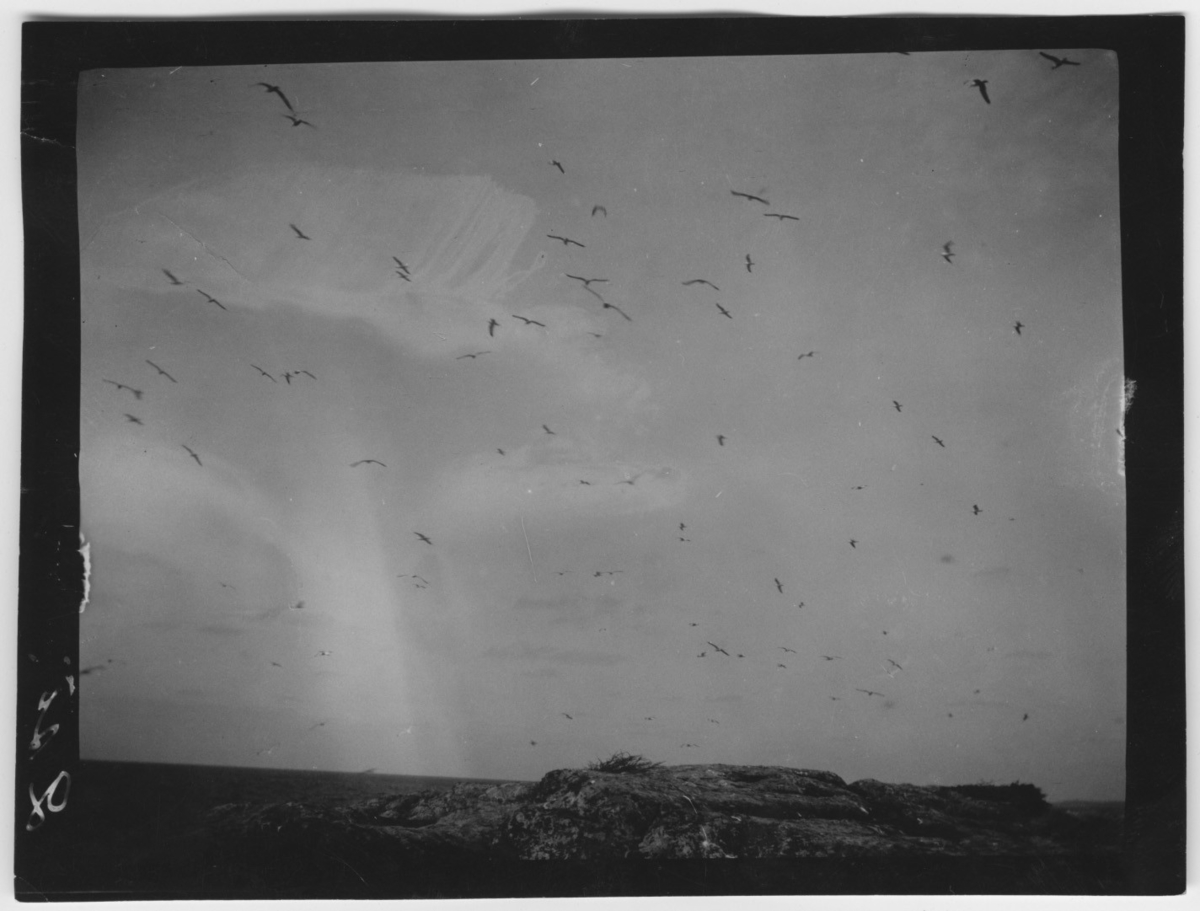 Bildtext: Fågelliv över häckplatsen. Fågelmoln.