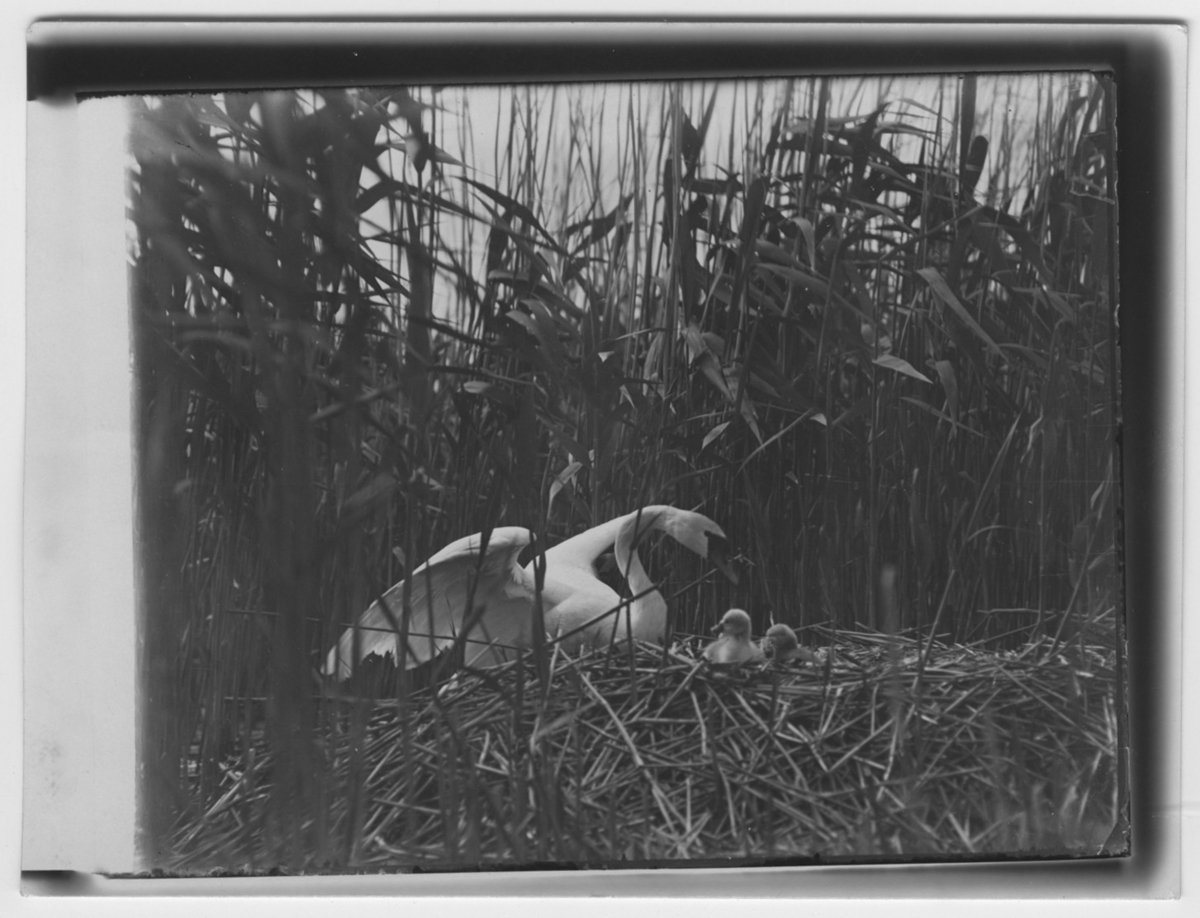 'Knölsvan med dunungar, i boet. :: :: Ingår i serie med fotonr. 1232-1246.'