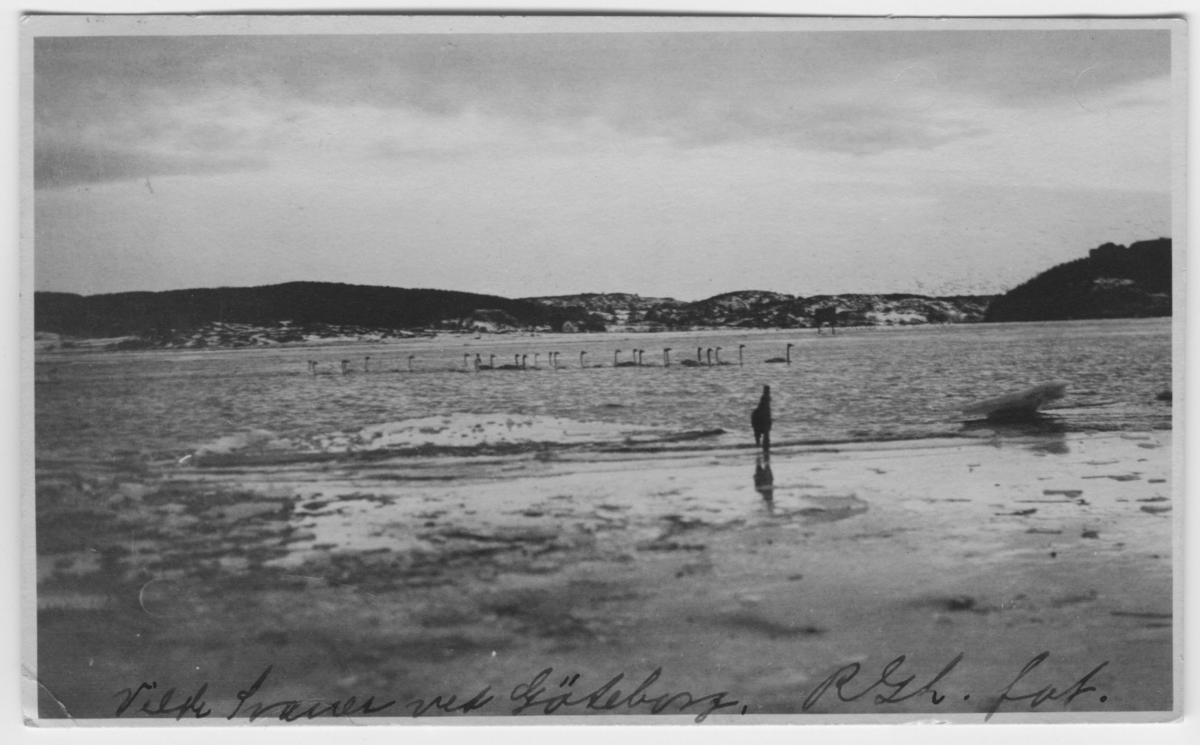 'Bildtext: ''Vilda svanar vid vid Göteborg.'' Svanar i vattnet, ca 25 svanar på led. I förgrunden ev. 1 person. I fonden delvis snöklädda kullar. :: :: Vykort skrivet till Leonard Axel Jägerskiöld 1929-03-25.'