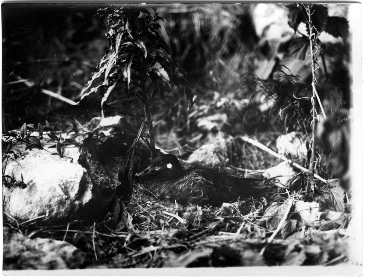 'Ruvande svärta i bo på marken. Sedd från sidan. :: :: Ingår i serie med fotonr. 1690-1708.'