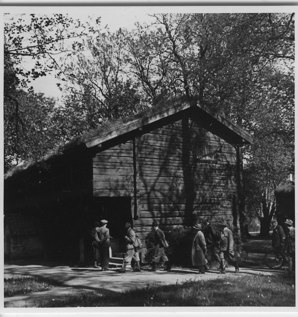 'Biologiska Föreningens utfärd till Oset och Kvismaren. :: :: Gruppen, ca 10 personer, män, framför ett knuttimmrat hus, fotograferat från avstånd. 1 av männen leder en cykel. Kläder. Klädsel. Bland de sista går troligen Leonard Axel Jägerskiöld. :: :: Ingår i serie med fotonr. 4386:1-18.'