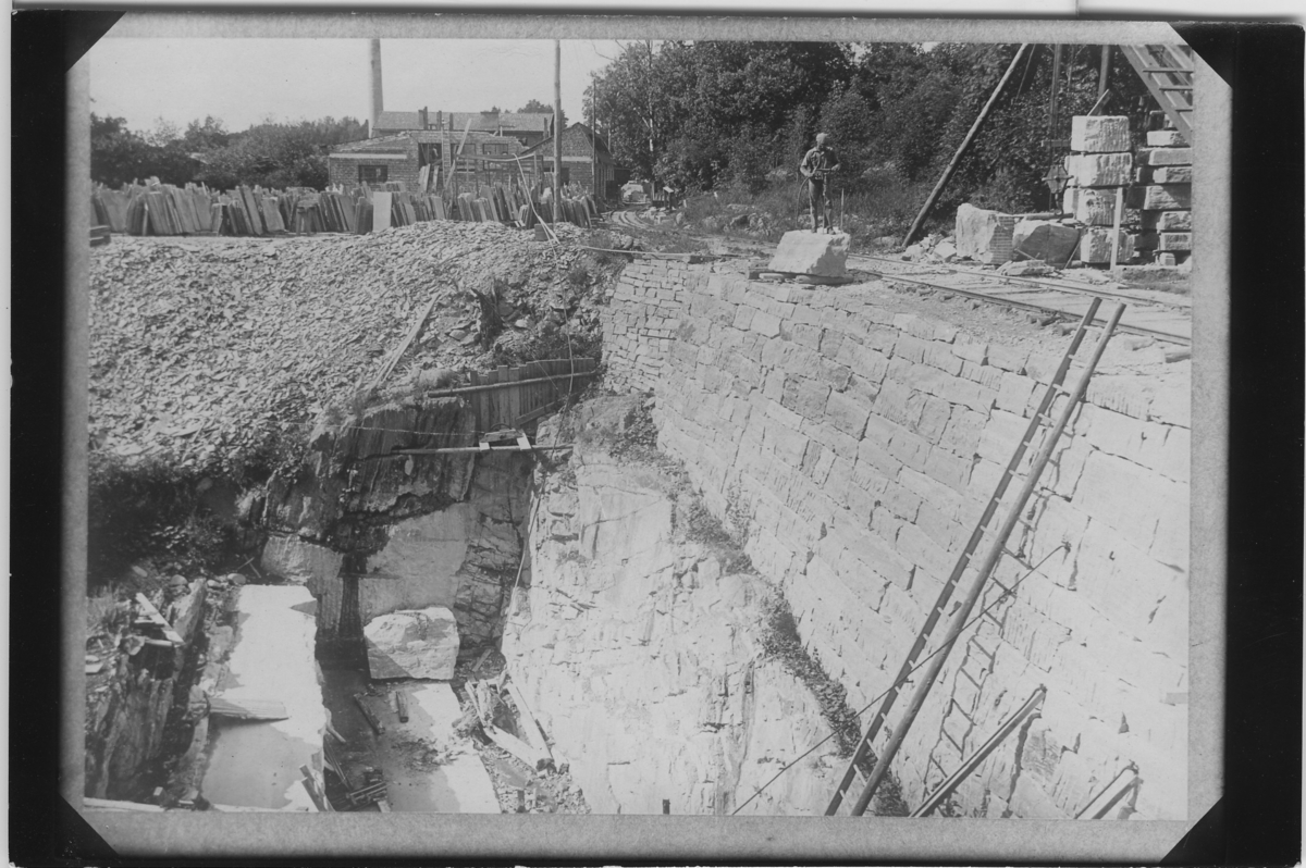 'Marmorbrott, vy över brottet, i arbete med brytning. En man med en borr bearbetar ett stenblock. På avstånd ett hus i sten och framför samling av marmorplattor. Lyftanordning till höger. Huggna block. :: :: Serie fotonr 4865-4867'
