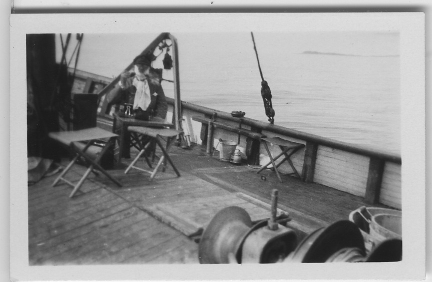 'Akkaexpedition, Bilder från Läsö och från båten (Skandia, FC 51). :: :: Professor Leonard Axel Jägerskiöld sittandes på däck, rökandes pipa i färd med att raka sitt skägg. Hink. Kaffekittel. Ihopfällbar stol. Veven. :: :: Ingår i serie 5089:1-63. Se även fotonr 2401-2453.'