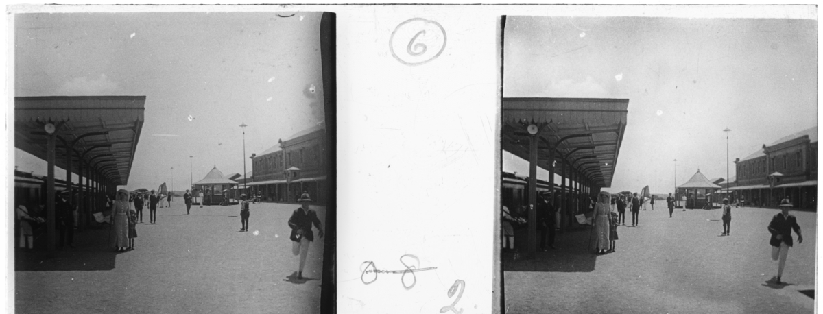 'Ca 10 personer vid perrongen på tågstationen Bulawayo. 1 kvinna med 1 barn i förgrunden. :: Enligt text till fotot: ''Bulawayo Railway station.'' (Bulawayo järnvägsstation) :: :: Ingår i en serie med fotonr. 5238:1-18. Se även fotonr. 5237:1-16, 5239:1-18 och 5240:1-17, 5241:1-18.'