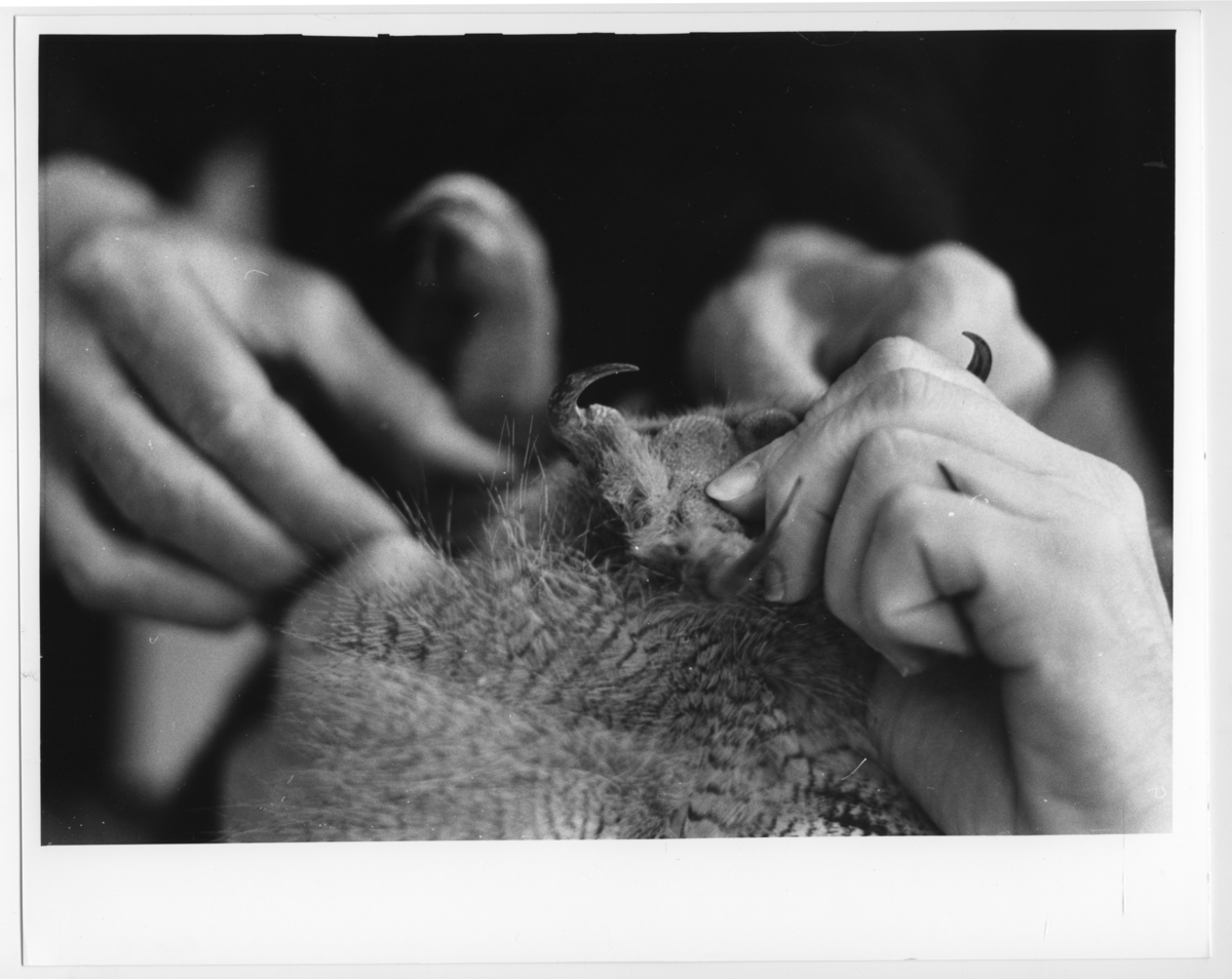 'Mätning av berguvar i ateljén, detaljbild klor. :: :: Ingår i seri emed fotonr. 5651:1-13.'