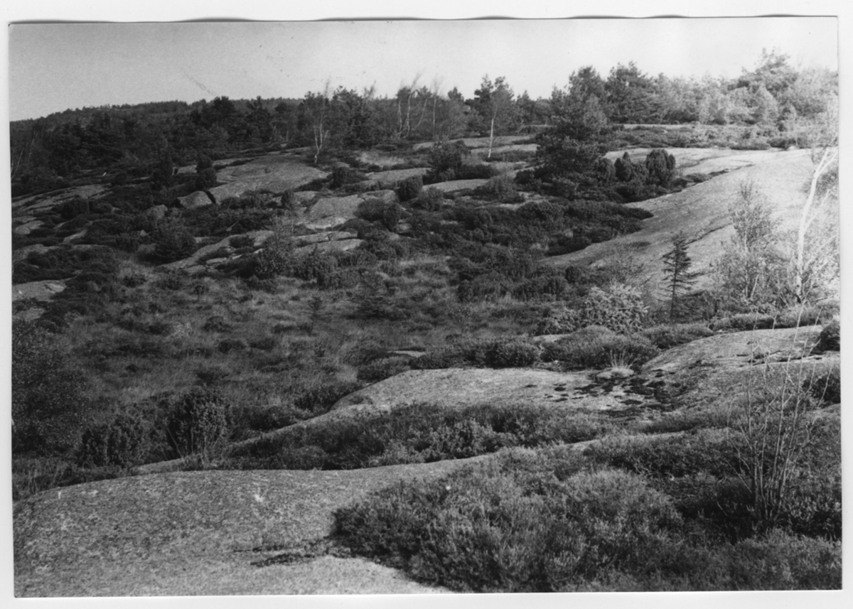 'Bildtext: ''Kärr i hällområde. Riktning 55.'' :: :: Ingår i serie med fotonr. 6970:1-1125, dokumentation av Hisingens naturgeografi, visande landskapsformerna i stora drag och gjord inför exploateringen av området. Platserna för fotograferingen finns utsatta på karta i skala 1:4000 som finns på Göteborgs Naturhistoriska musem. Fotoriktningen mättes med kompass i gammalgrader.'