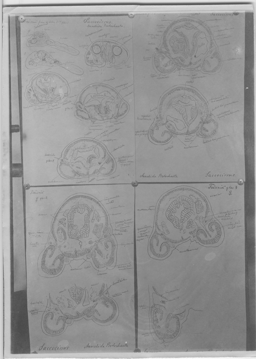 'Teckning av preparat på glas. Illustration av tvärsnitt av Annelida Protochaeta. Namn på delar är utsatta. :: Motivet består av fyra sidor som är uppnålade intill varandra. :: :: ''Fotografier använda vid dissektionskursen våren 1928'' . :: Avfotograferade teckningar på skelett och organ. :: På baksidan av vissa står det Kerstin Nyblén :: V.T.-18 :: , ur bok, Preparat'