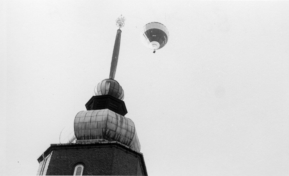 Titel: 'Oktober 1979. Översta delen av tornet på Göteborgs Naturhistoriska Museum. Luftballong med texten ''FOTO-RADIO-TV''. :: :: Ingår i serie med fotonr. 5527:69-216.'
