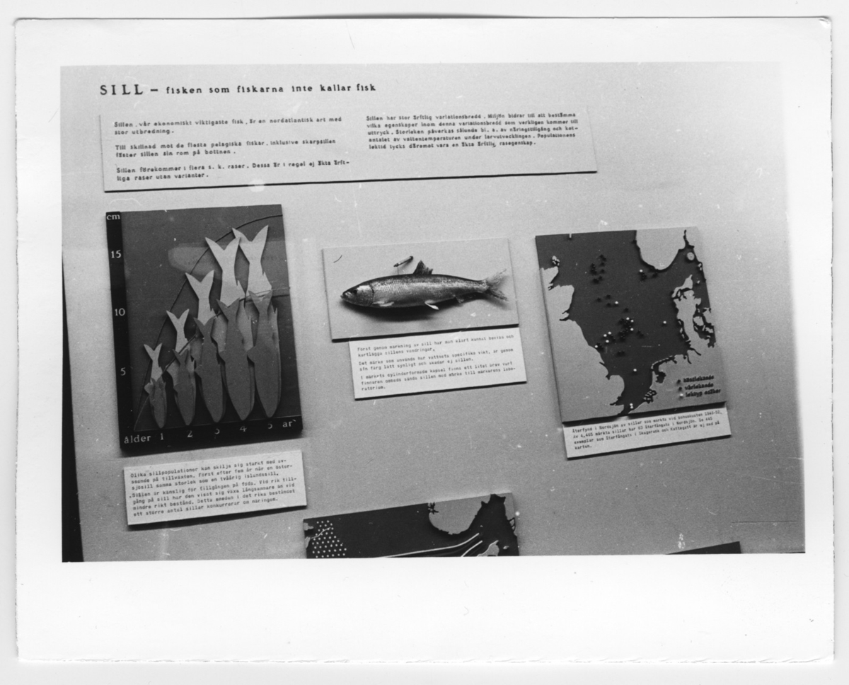'Utställningsskärm med titel ''Sill- fisken som fiskarna inte kallar fisk''. Sillens tillväxtkurvor, sillens vandring samt modell av sill. :: :: Ingår i serie med fotonr. 6963:1-12.'