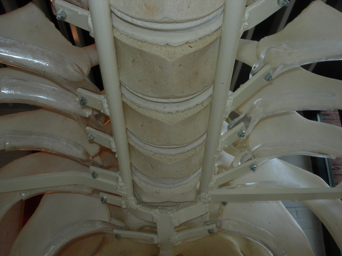 'Monteringsarbetet med näbbvalen, hane, Valders skelett: :: Närbild på kot- och revbensupphängning, ställningen på undersidan. :: :: Skelettet till näbbvalen är monterat och hänger i valsalen på Göteborgs Naturhistoriska Museum. Då näbbvalen sågs utmed kusten kom den att kallas Valder i media. :: :: Ingår i serie med fotonr. 7106 med bilder på näbbvalen som levande och under arbetet med att montera skelettet.'